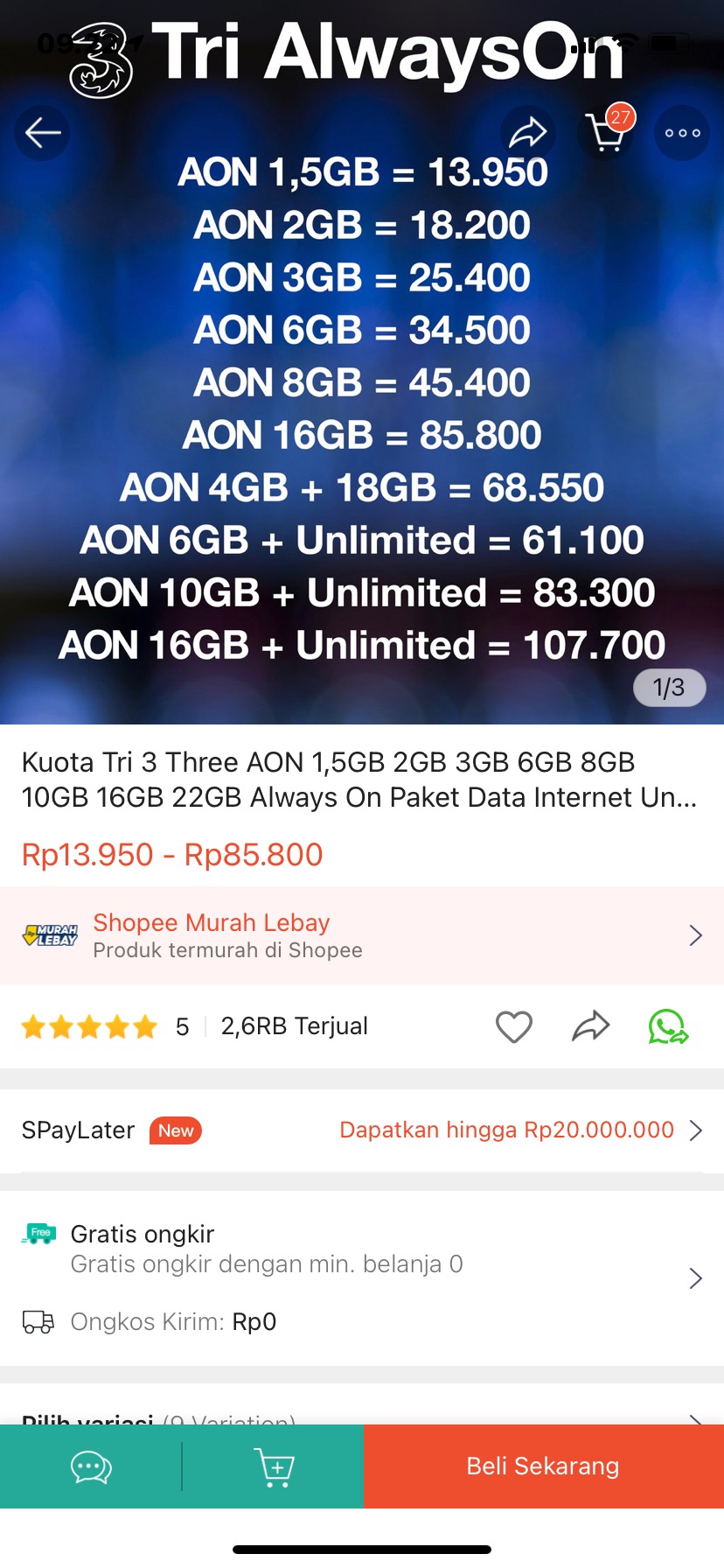 Kuota Tri 3 Three Aon 1 5gb 2gb 3gb 6gb 8gb 10gb 16gb 22gb Always On Paket Data Internet Unlimited Shopee Indonesia